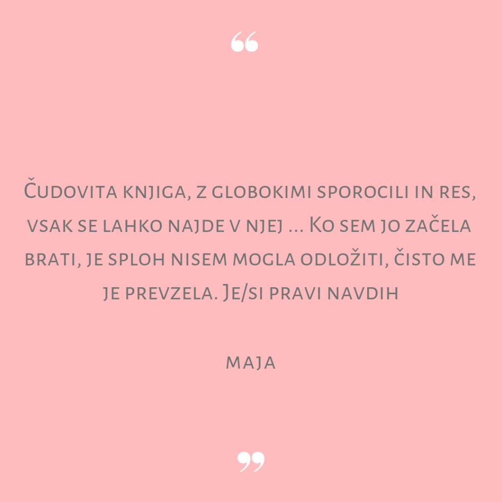 Knjigo priporočam tudi moškemu bralcu, saj bo v njej podrobno spoznal, lahko bi rekli kar sleherno žensko, njeno naravo, njene misli, potrebe in želje. Lažje bo razumel žensko dušo, ki kliče in vpije po nežnosti, dotiku, ljubezni, varnosti in pripadnosti. Pozoren bralec lahko ob prebiranju knjige marsikaj spozna in se »uči« razumeti žensko naravo v vsej veličini in edinstvenosti, ki se zdi dandanašnjemu človeku že kar sama po sebi umevna, a jo pravi moški zna prepoznati, občudovati in negovati.