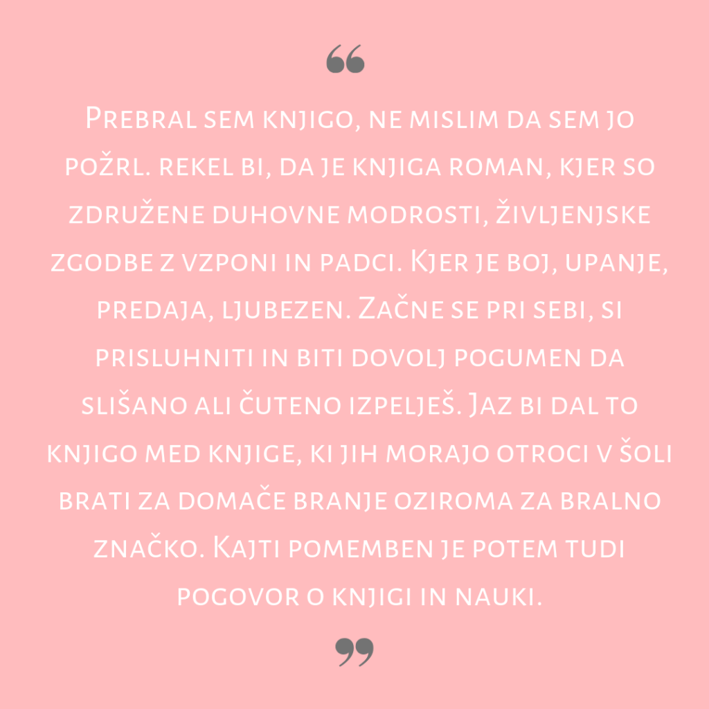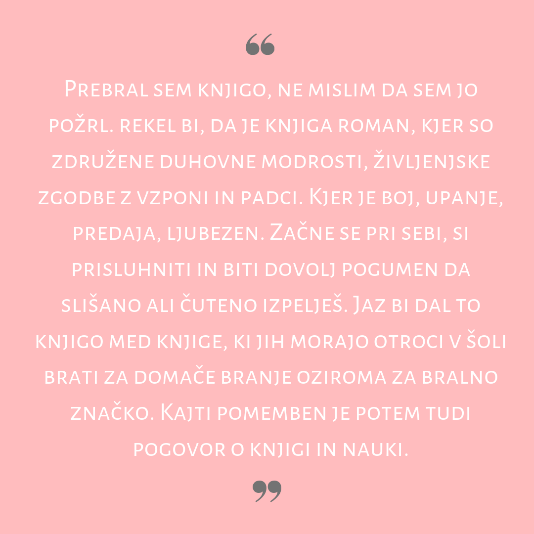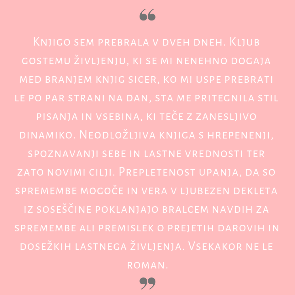 Najlepše v tem romanu se mi zdi, da je junakinja »ženska brez posebnosti«. Ženska s službo, ki jo lahko vsak čas izgubi, s sosedo, ki jo ustavlja, ko se ji najbolj mudi, z mamo, ki ji stoji ob strani, z upanjem, ki jo drži pokonci. Njena posebnost je, da se svoje neposebnosti zaveda, a se zato ne počuti prikrajšano, nasprotno, vztrajno sledi svetlobi. »Treba je jasno in glasno povedati, kaj hočeš,« je tako rekoč moto tega romana. Vse se zgodi, kakor se mora zgoditi.