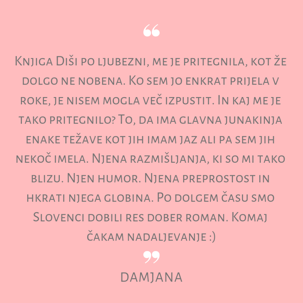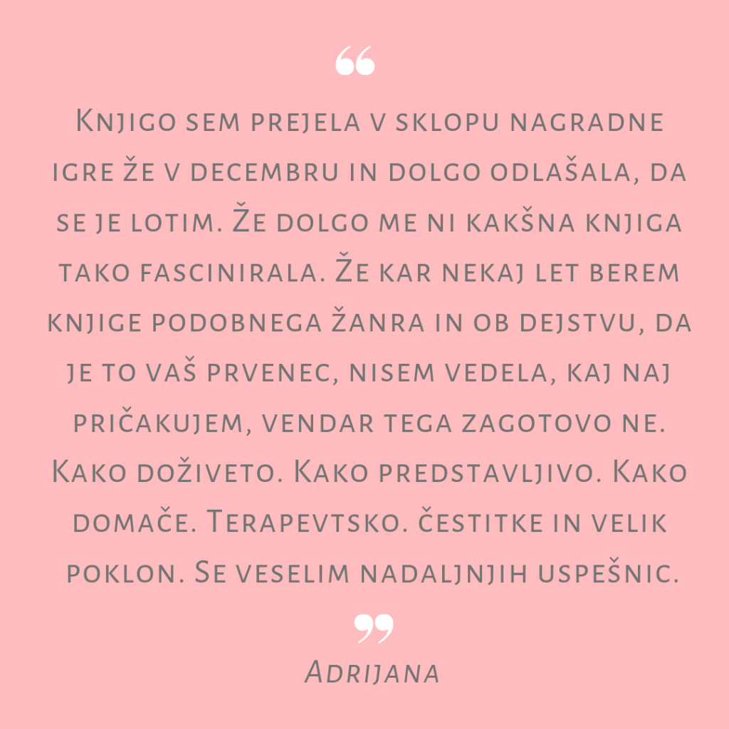 Anin prvenec je TOP, kot sem začutila že ob prvih prebranih straneh. Bere se tako, da knjige ne moreš spustiti iz rok. Pečejo se piškotki in se ob tem meditira, ravno prav je dražljivosti in globine. Diši po svežini, ženski in moškem, erosu, spiritusu, z veliko brbotajočimi hormoni, ki prinašajo ljubezen, raznovrstne odnose in odlične psihološke opise junakov ter stranskih likov knjige. Ostaja ne samo vonj, tudi okus radoživosti. Avtorici teče pero kot stopljeno maslo v testo njene bogate domišljije, talent se ji pretaka kot kri po žilah. Ravno prav napetosti poslovnega sveta in tudi pravnih zapletov v tej naši lepi zeleni deželi, pa še ravno pravšnji ščepec spogledovanja s tujino … komaj čakam nadaljevanje!